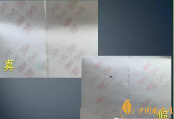 條盒底紋采用絲網印刷,墨層厚,觸摸有明顯的凹凸感,色澤亮麗。下圖側看真假對比效果。