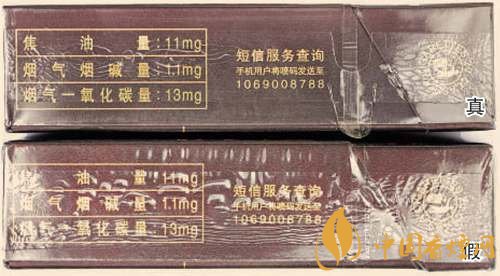 真煙商標紙采用復合鐳射銀卡紙,膠印和絲網(wǎng)印刷,“和天下”字體采用壓凸燙金工藝,用手摸凹凸感較明顯,且字體筆畫較粗,商標紙上字體、拼音、花紋看上去有較清晰的豎線;假煙一般為高清掃描仿制印刷,“和天下”字體用手摸凹凸感不明顯,且字體筆畫較細,商標紙上拼音、花紋等處豎線較模糊。