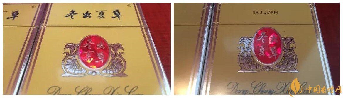 冬蟲夏草煙真假鑒別小盒頂部特征;左邊為正品,有裝飾花紋,而右邊的仿品不具備此特征。