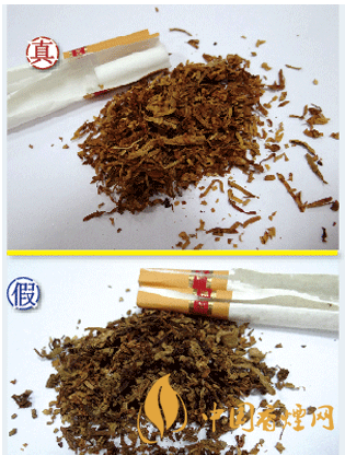 真品煙絲摻配均勻,采用獨(dú)特的“三烤”工藝,煙絲顏色呈現(xiàn)金黃色,煙絲彈性油潤性好;假煙煙絲摻雜摻假,煙梗煙末較多,煙絲未加膨化處理,煙絲碎屑多,與真品存在顯著差異。