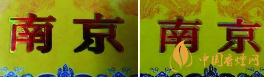 小盒商標(biāo)紙印刷工藝差異比對(duì):真品卷煙小盒商標(biāo)紙“南京”字體印刷由無數(shù)個(gè)相等小圓點(diǎn)組合而成且立體感強(qiáng),印刷工藝水平技術(shù)含量高,不易被仿制印刷;假煙小盒商標(biāo)紙“南京”字體采用普通仿制套印燙金工藝,字體沒有立體感和線條層次感,套印燙金工藝粗糙且邊緣有毛渣,與真品印刷工藝差異明顯。