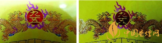 小盒商標(biāo)紙燙金套印工藝差異比對(duì):真品卷煙小盒商標(biāo)紙雕刻燙金套印工藝,龍鱗顏色均勻一致,龍珠里“九五”兩字燙金字體飽滿;假煙印刷工藝仿制粗糙,龍鱗顏色失真,龍珠里“九五”套印不準(zhǔn),字體邊緣有明顯脫漆掉色現(xiàn)象,與真品呈現(xiàn)效果差異明顯。