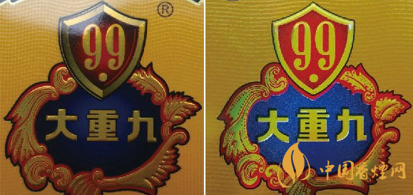 小盒商標(biāo)印刷工藝差異比對(duì):真品小盒商標(biāo)紙正面印刷工藝以藍(lán)色為底燙印“大重九”字樣,邊緣采用精雕細(xì)刻雕版燙金技術(shù),套色燙金均勻完整;假煙小盒商標(biāo)印刷采用“掃描照相”等仿制技術(shù),套色燙金嚴(yán)重失真,商標(biāo)圖案呈現(xiàn)出的效果與真品商標(biāo)圖案差異明顯。